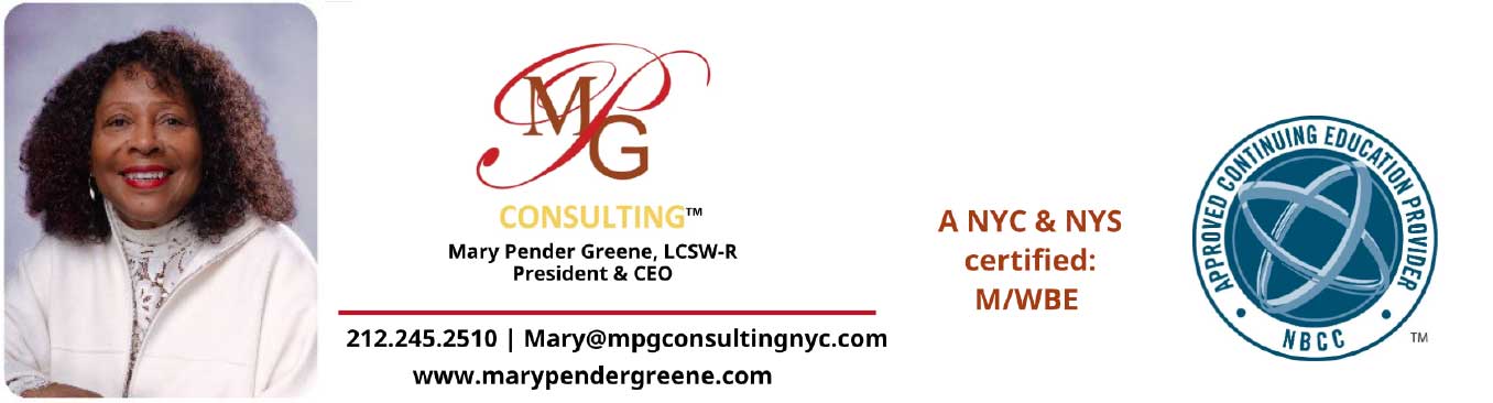 The New York State Education Department recognizes MPG Consulting as an approved provider of continuing education credits for: LCSWs, LMSWs, LCATs, LMHCs, LMFTs, Psychologists, and Psychoanalysts. MPGC is certified in New York State and New York City as an M/WBE.